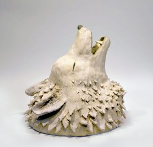 1枚目の写真:黒背景で作品のインパクトを与え、狭角のスポットライトで投射しています